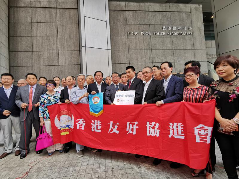 昨日下午,香港友好协进会副会长兼秘书长谭锦球等一行逾30人,当中包括吴良好、王国强、李君豪、李引泉、蔡毅、屠海鸣、刘与量、黄华康、马春玲等全国人大代表及政协委员在内,一同到警总门口进行声援行动。