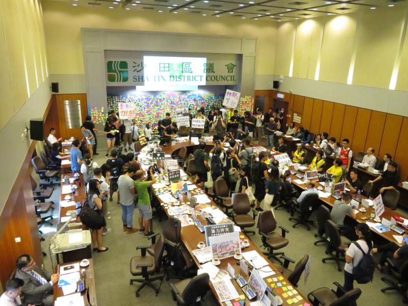沙田区议会上,反对派要求讨论7月14日沙田暴乱中警方“围堵示威者”,却不提警方途经商场去另一处制止从高处投掷砖块施袭的暴徒时,被另一批暴徒在中途率先发难施袭。反对派在会上又联同支持者叫嚣,令会议无法展开,最终流会。