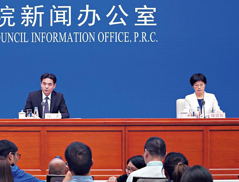 图:国务院新闻办公室昨日举行新闻发布会,请国务院港澳办新闻发言人杨光、徐露颖介绍对香港当前局势的立场和看法,并答记者问\新华社