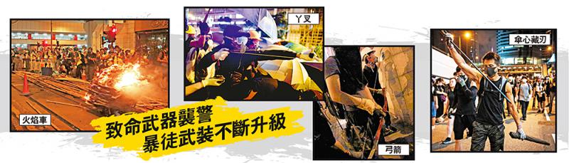 暴徒更针对警察使用致命武器。警方表示,在周日的驱散过程中,警员在上环文华里检获可以射击的弓箭。有暴徒将附近路边拆毁的大型路牌及重型杂物,由高处掷向街上警员,掉下来的冲力毁了交通灯。有警员被“丫叉”射出的钢珠、波子射中。有暴徒与警方对峙时手持两米长的自制长矛。警方驱散行动中检获的武器包括削尖行山棍、棒球棍,改装铁通,可见暴徒对警员作出的袭击行为是明显有针对性及不顾后果。