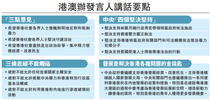 国务院港澳办两位新闻发言人杨光和徐露颖在记者会上皆提到,香港当前最重要任务是坚决依法惩治暴力犯罪行为,尽快恢复社会安定,维护香港的良好法治和营商环境。