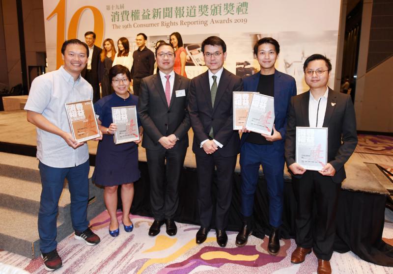 图:第19届消费权益新闻报道奖,大公报荣获文字组别(调查报道)银奖和文字组别(新闻/特写/评论)铜奖。左起赖振雄、李雅雯、林定国、邱腾华、谢进亨、李卓燊 大公报记者林良坚摄