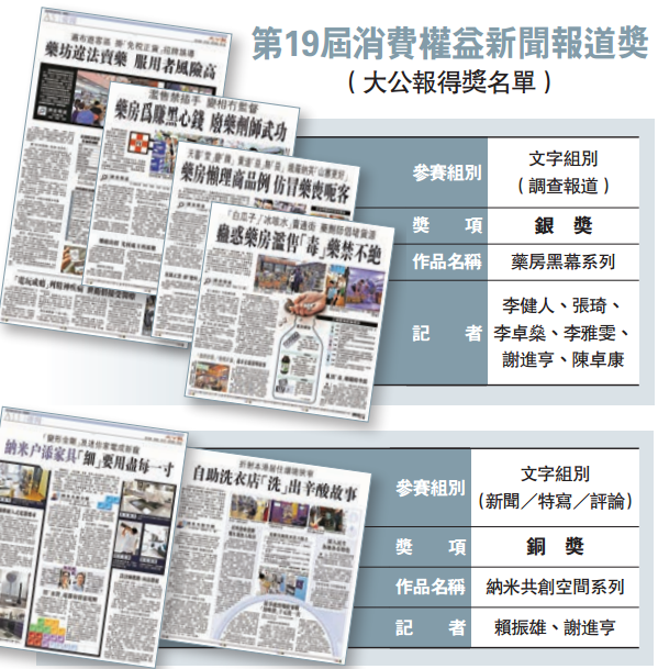 【大公报讯】消费者委员会昨日颁发第19届消费权益新闻报道奖,《大公报》凭《药房黑幕系列》、《纳米共创空间系列》报道,分别夺得文字组别(调查报道)银奖和文字组别(新闻/特写/评论)铜奖。