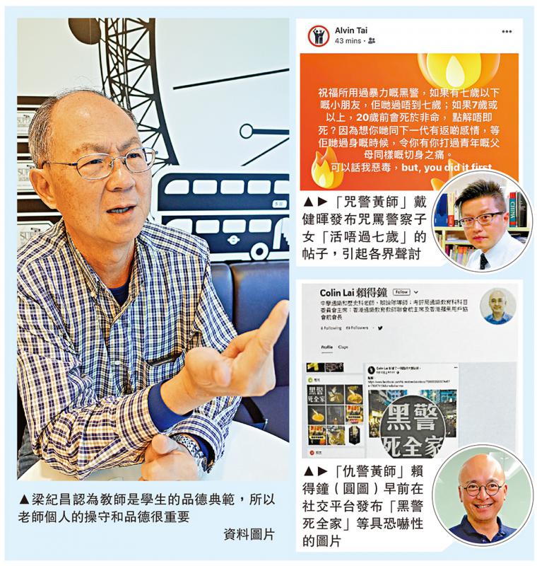 香港鲜鱼行学校退休校长梁纪昌直言,如果老师常常想着报仇、杀警,又诅咒和攻击警察,会影响教师自己的心态。他更担心,如果学生表现不如他意,即会产生报复心态。梁纪昌认为,教师这工作和一般工作很不同,因为教师是学生的品德典范,“小朋友成长的时候,除了家中与父母相处,大部分时间便是回校上课。学生学习知识以外,最重要是学做好人,而不是学做坏人;很多小朋友都不是用听的,而是看你的言行如何,所以老师个人的操守和品德很重要,否则很难教导学生,学生亦不会服你。”