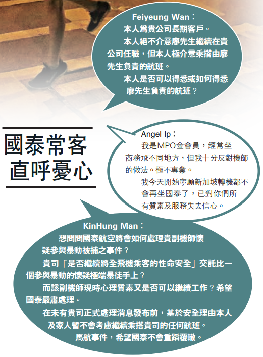 国泰航空副机师廖颂贤参与7月28日上环暴动被控暴动罪,昨日提堂却获准保释,并可继续执飞,引起全港市民哗然,质疑机师偏激思想及暴力行为,威胁航机乘客的安全,极度担忧马航MH730事件重演。惟国泰航空全不理会乘客担忧,回覆仅称“因私隐关系”,拒绝评论。航空界、法律界、立法会议员均认为,国泰应立即将该名机师停职,释除乘客疑虑。民航处表示,航空公司有责任确保机组人员在各方面均适合及准备就绪,才执行飞行任务。