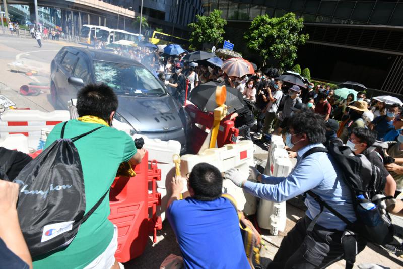 余党则趁机在男司机动弹不得时,以喷漆在车头冚及车身喷上侮辱字句,并扑爆车窗。未几,有暴徒见愈玩愈过火,突然“淆底”,叫其他暴徒将司机松绑放行。当司机上车时,犹有余悸。挞车后,马上即踩油撞开水马,暴徒犹嫌不足,再以雨伞及行山杖扑打车窗。惟司机没有理会,将车退后然后再高速向前驶离现场。多名靠近私家车一直扑打车窗暴徒其后跌倒,更反咬“系私家车想撞我哋呀!”警员接报到场,正设法联络车主。而救护员则在场为伤者检查及治理伤势,其后送院治理。