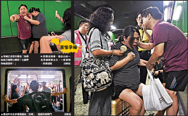 其中在炮台山站,十数名冷血暴徒连番冲击港铁月台,孕妇无辜遭殃。一名孕妇在候车时,怀疑因等候时间太长,空气局促不适晕倒月台。一直“仁义道德”挂在口边的暴徒,站在一旁冷眼旁观,并无上前协助。孕妇丈夫一边扶着妻子,一边怒斥暴徒:“你哋知唔知自己做紧乜嘢呀?乜都畀你哋搞冧呀!自己反思吓,成日话政府无反思,你哋自己有无反思呀?”