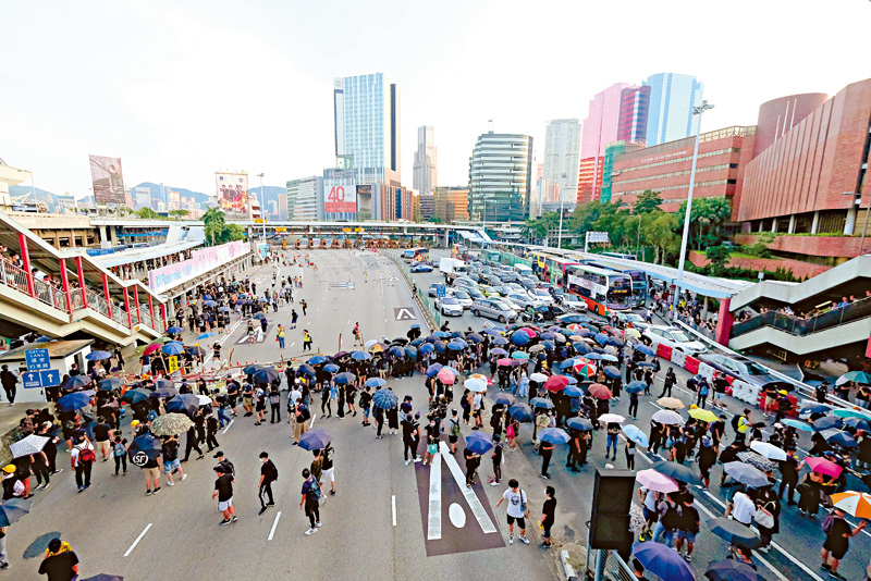 暴徒发动全港性罢工罢市罢学的所谓“不合作运动”,昨晨起四出捣乱,快闪式堵塞多区主要道路。昨晨七时许,有十多名身穿黑衣暴徒“快闪”堵塞多条主要道路,包括龙翔道、鲤鱼门道及红隧九龙入口等。元朗亦有人堵路,司机与市民爆发冲突,路面交通一片混乱。而港铁全线超过十个港铁车站,同时爆发冲突场面。其中炮台山站、荔景站、元朗站、屯门站、钻石山站、大埔墟站都有大批暴徒阻碍列车开出,多条港铁线路暂停服务。