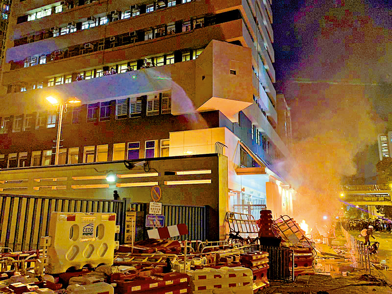 继昨早繁忙时段在多站阻挡港铁列车、强迫市民“罢工”,暴徒昨日又在全港多区发动“恐袭”,制造动乱及恐慌,殃及多个警署及多条道路,不少报案室、紧急车辆通道、诊所、康文署设施、劳工处办事处、政府合署等公共设施服务受阻甚至暂停。暴徒在马路上、警署外大肆纵火,又向警署和纪律部队宿舍不断掷砖及燃烧弹。暴徒在下班时段再度堵塞红隧,交通全瘫。警方全日警告无数不见效之下,被迫使用催泪烟等驱散暴徒,制止暴力。\大公报记者 冼国强