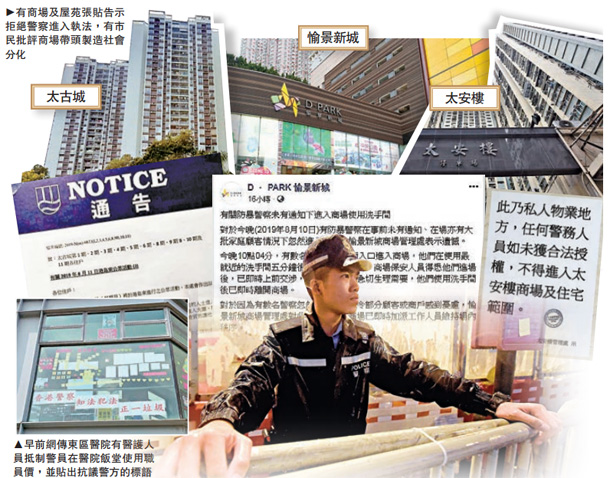 纵暴辱警不可一不可再!暴力冲击蔓延全港,警队顶住压力坚守岗位,竭力维持社会秩序,但执勤期间不时面对刁难。有商场及屋苑张贴告示拒绝警察进入执法,甚至有商场在社交媒体发文,对警员事前未有通知便进入商场借用洗手间表示遗憾。有市民批评商场带头制造社会分化,反问“警察有生理需求有何不妥?”“警察亦是人,何解需要这样排挤和歧视?”警察员佐级协会主席林志伟质疑,商场贴告示拒绝警察进入是向暴力示弱,对于有商场疑似拒绝警员使用洗手间,他认为完全是不人道及不可接受。\大公报记者