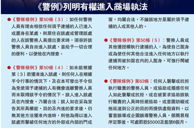 部分商场地契条款清楚列明警方可畅通无阻进出执法,包括早前发生冲突的沙田新城市广场、沙田中心、沙田广场、好运中心、金钟太古广场和上水广场等,而即使部分商场没有相关条款,但不少商场因设有公共空间,地契条款中有因应公众安全订立的条款,例如业主需确保该等地方畅通无阻。