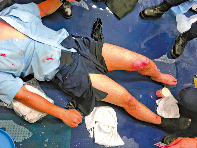 图:尖沙咀警署内有警员被暴徒投掷的汽油弹击中,腿部灼伤,衣服多处有血迹