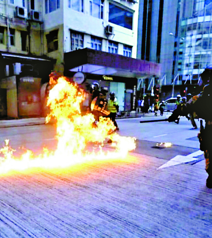 乱港暴力再升级!昨日有暴徒疯狂向尖沙咀警署投掷汽油弹,导致一名警员双腿分别受到一级及二级烧伤,需送院治理;有暴徒用强力的仿制美军M320榴弹发射器射击警员。警务处处长卢伟聪探望受伤警员,对于暴徒罔顾他人安全的非法暴力行为,卢伟聪感到非常愤慨,并予以最强烈谴责,强调警方必定全力追究。市民对暴徒捣乱社会行径非常愤怒,力撑警队严正执法,尽快止暴制乱。警队昨日果断出击,在各区迅速清场平乱,获市民支持叫好。\大公报记者 冼国强(文) 摄影组(图)