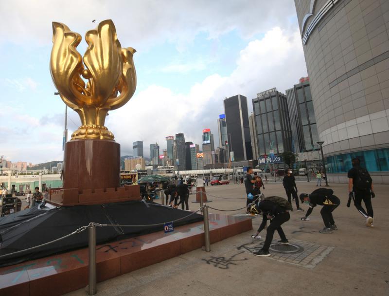 暴徒昨日下午近5时半,流窜至金紫荆广场后立即大肆破坏,在金紫荆广场中央塑像的底座喷上黑字,又胡乱贴上标语,迅速离开。事发时无人被即场拘捕。