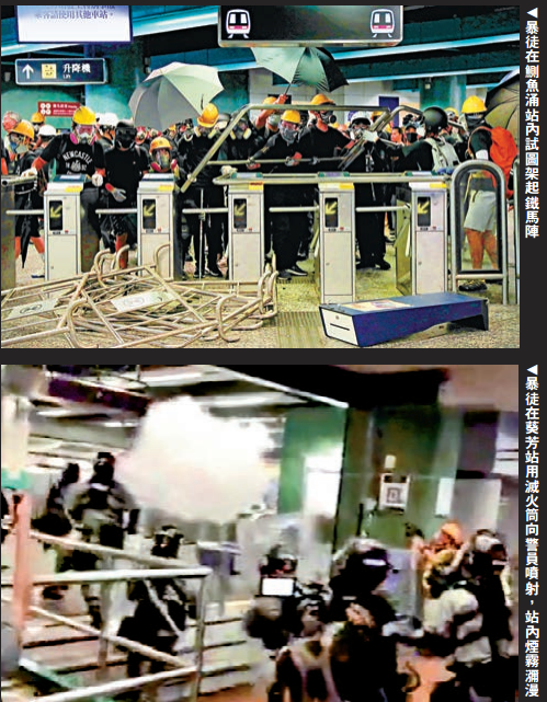 暴徒晚上还在葵芳港铁站与警方发生激烈冲突,站内一度烟雾弥漫,网上马上出现警方在港铁站发射催泪弹的流言。警方澄清表示,站内警员发射的是橡胶弹,现场所见的烟雾是示威者用灭火筒喷向警员所造成。