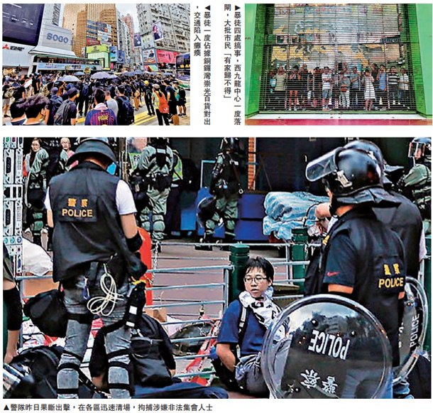 另外,有网民昨日在维园发起港岛东非法集会,暴徒在集会后于铜锣湾、湾仔、北角、鲗鱼涌等多区肆虐,四处设路障瘫痪交通,其间亦曾向警方投掷汽油弹,还再次涂污金紫荆雕塑。一日之间,港九多区再次伤痕累累,幸有警方迅速清场,令各区尽早回复安宁。