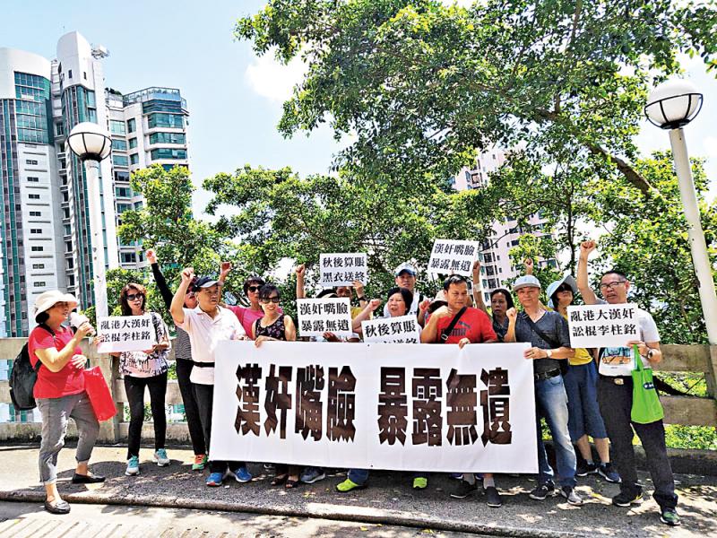 【大公报讯】记者刘昕报道:约30名市民昨日自发到民主党创党主席李柱铭的办公室及住宅外示威,谴责李柱铭在中美贸易战打得如火如荼期间,多次赴美国及加拿大会见反华分子,勾结外国势力卖国,是不折不扣的汉奸。团体先到李柱铭位于金钟海富中心的办公室地下大堂示威,他们拉起写有“汉奸嘴脸、暴露无遗”的横额,高举“乱港大汉奸、讼棍李柱铭”、“秋后算帐、黑衣送终”等标语,高呼相关口号,随后又到李的半山住宅外抗议。