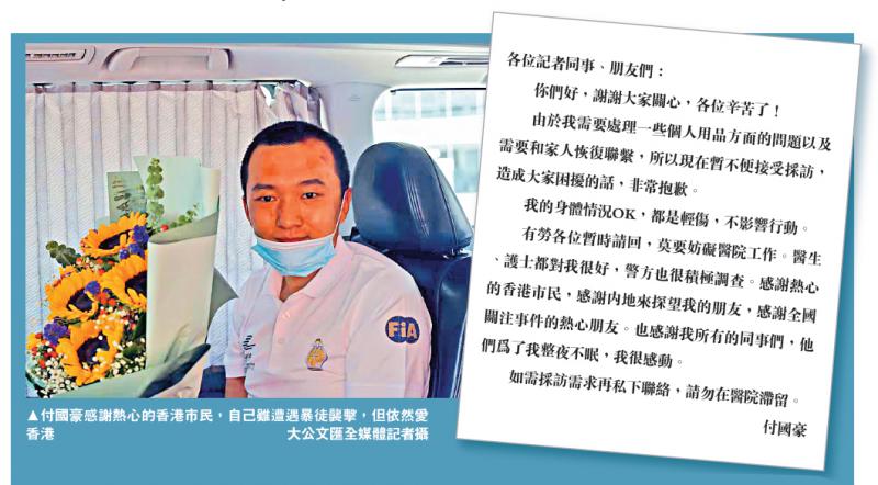 付国豪为所有关心他的人写了一封感谢信:“医生、护士都对我很好,警方也很积极调查。感谢热心的香港市民,感谢内地来探望我的朋友,感谢全国关注事件的热心朋友。也感谢我所有的同事们,他们为了我整夜不眠,我很感动。”