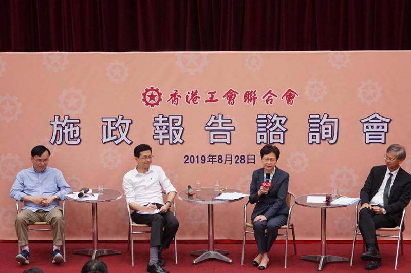 行政长官林郑月娥正就新一份施政报告收集意见,继八月中约见工联会代表后,昨日更联同劳工及福利局局长罗致光等官员亲临“工联会施政报告谘询会”,直接与250位工会代表和基层工友会面,听取意见。