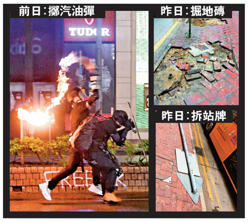 暴徒前日(周六)在湾仔、铜锣湾等闹市疯狂破坏,放火焚城。大公报记者昨日重返灾场观察,湾仔轩尼诗道沿途多处地面砖块被掘出,摆在路边四周。各个巴士站亦惨遭暴徒毒手,巴士站牌被拆倒塌在路边,广告灯箱整块玻璃被敲碎。暴徒拆下修顿球场的两个看台,一个被推至分域街街口,昨午三时许由起重机清理带走,另一个被推到湾仔卫兰轩酒店门口对出巴士站。市面气氛看似恢复平静,但路上行人疏落。