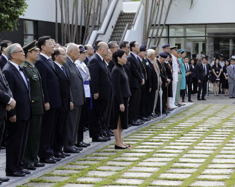 图:全国政协副主席董建华、行政长官林郑月娥、中联办主任王志民、驻港公署特派员谢锋等出席中国人民抗日战争胜利74周年纪念仪式