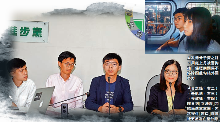 “港独”暴乱分子黄之锋等三人昨日前往台湾“立法院”拜会民进党党团,与干事长管碧玲、书记长李俊俋、立委王定宇等人闭门会议约一小时。