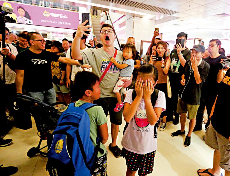 图:一名携三名子女在商场逛街的小学老师,不满暴徒乱港教坏细路,唱“国歌”对抗暴徒的杂音