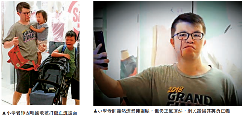 【大公报讯】世风日下,好爸爸向子女言传身教唱国歌,竟遭打到血流披面!乱港分子昨晚在黄大仙、沙田、九龙湾、红磡、屯门等多区滋事,在商场高唱“独歌”及辱警歌曲,一名携三名子女在商场逛街的男子路见不平,不满暴徒乱港教坏细路,随即唱“国歌”独力对抗暴徒的杂音,惨遭围殴。