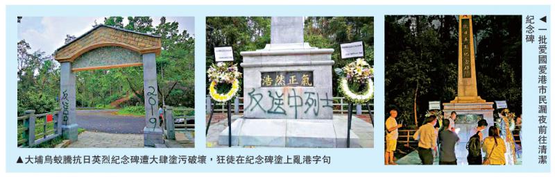 今日是标志14年抗日战争开端的“九一八事变”88周年,大埔乌蛟腾抗日英烈纪念碑昨被发现遭大肆涂污破坏。政界人士批评,狂徒侮辱民族英雄、抗日烈士,反映其泯灭良知的卑劣本质及对历史的无知、对恩人前辈的背叛,与当年侵略者及汉奸所为一样,这种表达诉求的方式绝不能接受。有爱国爱港市民昨日漏夜已经将纪念碑清洁干净。\大公报记者 庄恭诚