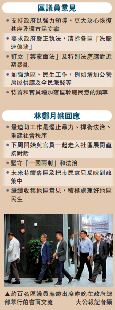 “现在最迫切的工作就是遏止暴力、捍卫法治、重建社会秩序。”林郑月娥表示,她和整个管治团队会以真诚、深入的态度,与社会各阶层、不同背景和政见的人士直接对话,聆听大家的声音,包括对社区问题、社会现状及稍后发表的施政报告的意见,从而令政府的工作做得更好,亦让市民直接发表心中的不满、抑压的看法。她澄清,这次与区议员会面并非早前所提及的落区,下周开始她和政府官员就会走入社区展开直接对话。