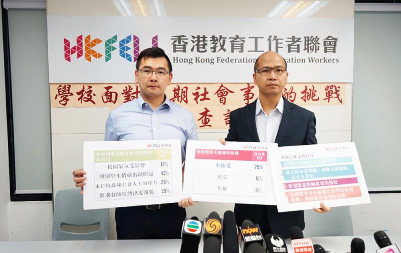 【大公报讯】记者黎慧怡报道:过去三个多月的社会暴力纷争至今仍未平息,有团体更发起罢课,令学校面对不少挑战。教育工作者联会最新调查发现,虽然超过九成受访学校过去一周已没有学生参与罢课,但半数校长反映校园气氛已受影响,个别师生的情绪亦出现问题;一成受访校长更称日常教学已受到干扰,包括有学生要求教师作政治表态,亦有学生受到杯葛排挤,主要因为家庭背景、政治立场不同而被同学踢出聊天群组、遇受冷言冷语等。教联会促请当局定期向学校发出具体指引,密切关注校园欺凌情况。
