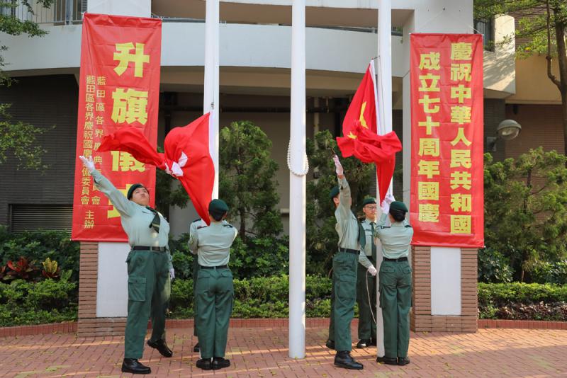 蓝田邨广场昨挂出“庆祝中华人民共和国成立七十周年国庆”条幅,众多街坊和市民齐集,现场洋溢着喜庆气氛。早上八时,青少年军总会升旗手以中式步操步入升旗区,伴随着国歌奏响,国旗与区旗缓缓升起,市民齐唱国歌。