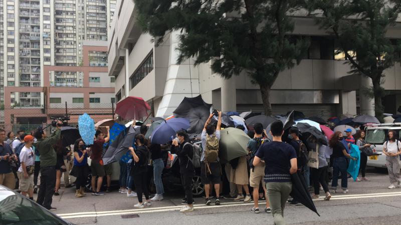 图:众多蒙面者在法院外组成“雨伞阵”,掩护两名被告保释离开,又用伞拍打记者的相机镜头\大公报记者摄