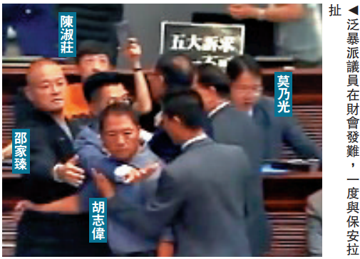 本届立法会昨早举行任内最后一年度会期的首次财委会,唯一议程是选出正副主席。泛暴乱派议员却针对原本简单、常规的程序挑起战火。“议会阵线”朱凯廸、区诺轩、陈志全、范国威、毛孟静先后在座位上叫嚣,声称须先解决所谓“警察暴力”,要求以上任财委会主席身份主持会议的陈健波,不把涉及警队加薪的公务员薪酬调整项目列入之后的议程,否则不应开会。朱凯廸又再次以所谓的“警察性侵”、暴徒“死于非命”等谣言大做文章,高叫口号扰乱议会。