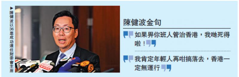 立法会财委会昨日继续进行新一届正、副主席选举,但会议未开始,“泛暴乱派”先玩拉布,下午更“玩嘢”企图瘫痪议会,范国威、朱凯廸、许智峯先后被逐出会议厅,而毛孟静、区诺轩等人则阻碍投票。扰攘一轮之后,陈健波最终以36票成功当选财委会主席。陈健波预示日后的工作将会很困难,但会勇于承担,并呼吁议员与特区政府沟通,希望立法会能有规矩做事,令香港重回正轨。\大公报记者 段远峰