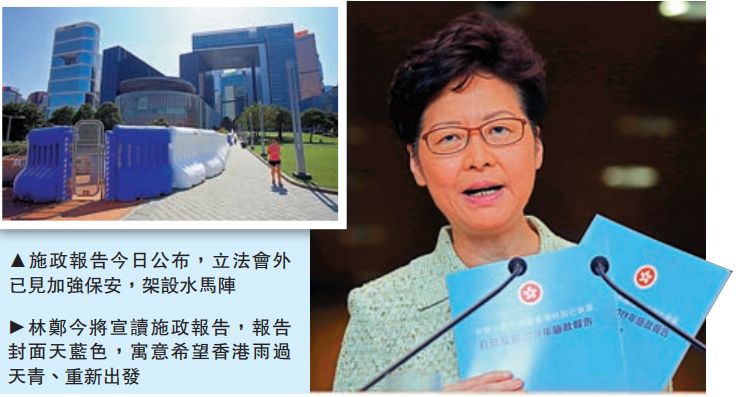 林郑月娥昨日出席行政会议前表示,新一份施政报告在非常困难的环境下编制,封面颜色主调沿用其喜爱的天蓝色,寓意希望香港很快雨过天青、重新出发。