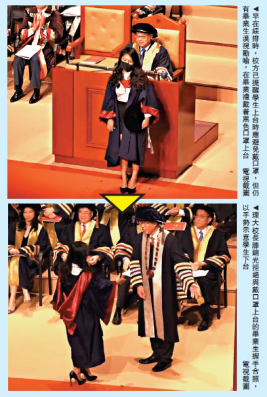 香港理工大学昨日举行第二十五届毕业典礼,有毕业生抱着挑战心态,不理劝喻坚持戴口罩上台,校长滕锦光当场拒绝与毕业生握手合照,以手势示意学生下台。教育界赞扬滕校长的做法才是“真正的教育”,他向学生释放出大学是学术交流的场所,而非政治角力场的深远意义。\大公报记者 殷向善