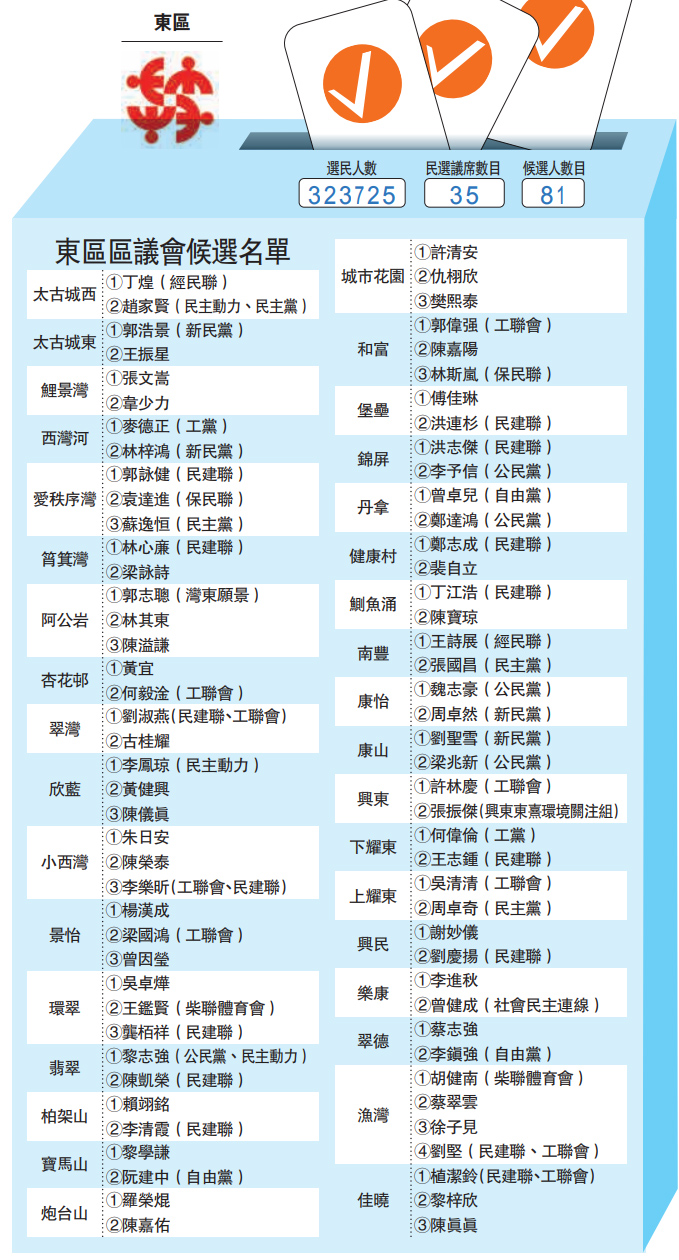 东区为香港岛议席最多的一区,选民人数接近其他三区的总和。上届十区候选人自动当选的情况已成历史,“泛暴派”向建制阵营发起全面抢攻。