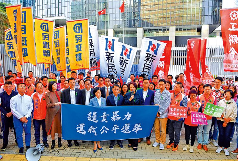 新民党主席叶刘淑仪表示,自从6月修例风波发生之后,暴力不断升级,新民党多个办事处被破坏和纵火,无法为市民提供服务。此外,候选人摆街站、派发单张被包围,亦有候选人的义工被汽车撞倒,很多选民眼见这些情况,均表示不敢前往投票,担心事后被“点相”和“起底”。她认为,选管会有责任确保选民的人身安全,令他们安心投票,亦呼吁社会各界人士停止所有暴力行为。