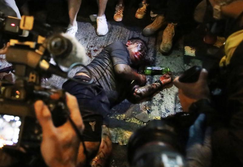 图:暴徒行径灭绝人性,但泛暴派议员仍不肯与暴徒割席。图为旺角前晚数十名暴徒对一名男子行私刑