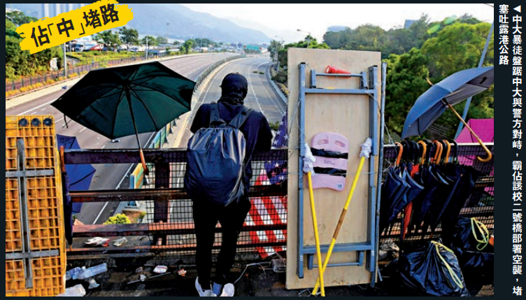 中大经历连日暴乱浩劫后,昨天情况看似缓和,但校内暴徒已等同占领了大学,操控了校园运作,包括在大学门口架设检查站,所有进入大学内的人,都要排队等候,被门口站岗的暴徒检查证件,搜查随身袋及裤袋,方可进入校园;暴徒又于校内加设多幅砖墙,校门附近亦广布车阵,企图妨碍警方入校执法。