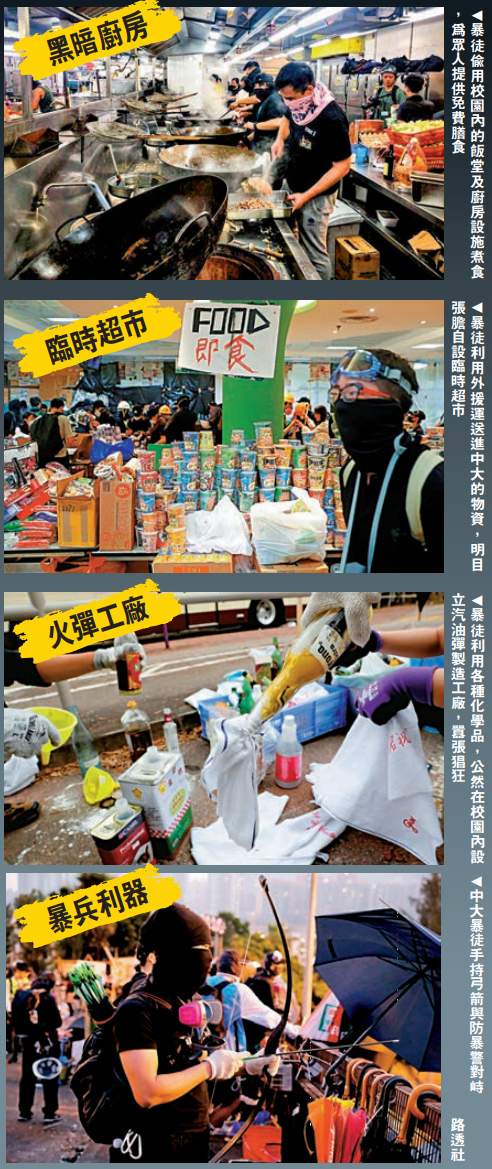 守闸的蒙面暴徒充当中大的保安领导,竟和身边的人下达命令“五点后只准记者入”,“六点后只可出不可入”。另外,大公报昨天报道的“汽油弹工场”,在校内已是肆无忌惮地运作,无遮无掩在中大马路旁出现,暴徒们更分工有序、有说有笑地以化学物制作汽油弹,面上全无处理危险品的反应。另外又见一批暴徒用电锯伐树木,一批则用烧焊机锯铁栏作铁枝,利用中大校园的丰富资源,不断制作武器。