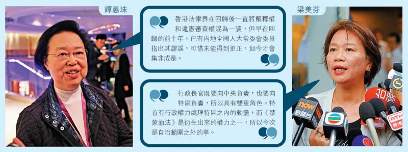 针对全国人大法工委对《禁蒙面法》司法覆核案判决的关注,泛暴派歪理连篇,公民党郭荣铿声称,法工委的讲法是从根本上否定本港司法机构审理有关本港法例违宪审查的权力。多位法律专家接受《大公报》访问,反驳泛暴派谬论。基本法委员会副主任谭惠珠指出,泛暴派将法院拥有对法律条文的解释权和违宪审查权混为一谈,混淆视听。她强调,解释权与违宪审查权是两个概念,只有全国人大常委会拥有违宪审查权,香港法院并无此权力。\大公报记者 海芯葆 高仁