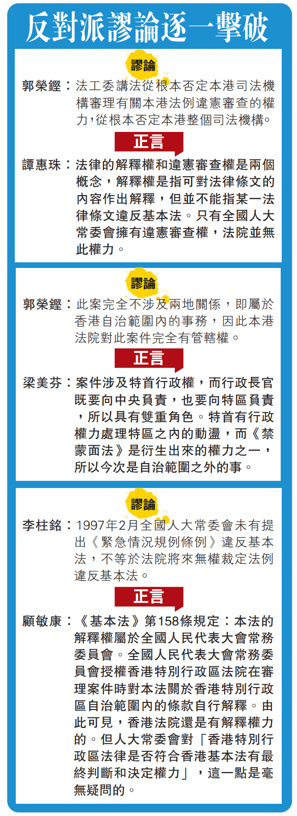 谭惠珠指出,香港法律界在回归后一直将解释权和违宪审查权混为一谈,但早在回归的前十年,已有内地全国人大常委会委员指出其谬误,可惜未能得到更正,如今才会集非成是。