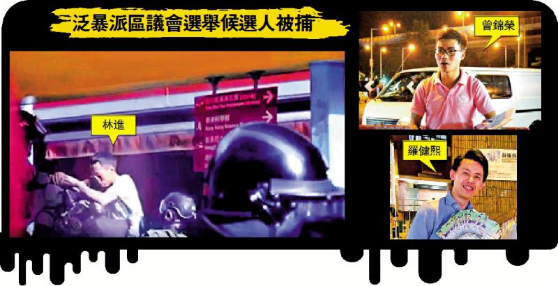 此外,元朗瑞华选区候选人林进亦被捕。11月17日,理大战况激烈,警方把暴徒重重包围。11月18日,匿藏在理大的暴徒被警方围困多时仍拒绝缴械,晚上有数十人从校园新行人天桥游绳而下,登上在行车天桥接应的电单车逃走,亦有人徒步离开,其后被警方发现,数十名防暴警员在马路上戒备并发射催泪弹,天桥上有人向警方防线发射弓箭。未能逃走的暴徒试图逃回理大,有人在逃跑时被捕,其中包括区选元朗瑞华选区候选人林进。