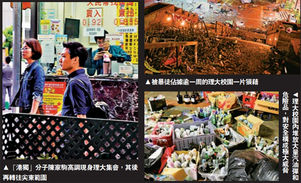 理工大学自本月17日起被黑衣暴徒“占领”,至今超过一星期,校园内仍有数十名暴徒死守,继续逃避法律制裁。刚在区议会胜出、气焰嚣张的一批泛暴派准区议员玩弄民粹,在选举后继续食“人血馒头”,打着所谓“拯救手足”名义,昨午再次煽动群众到理大附近集结,实则为变种谢票大会,继续借暴乱谷“人气”。/大公报记者 段远峰