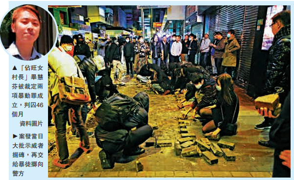 近月沦为“暴乱重灾区”的旺角,于2016年大年初一半夜爆发暴乱,自称“占旺女村长”的毕慧芬当时协助暴徒掘砖和掷物件入火堆,早前被裁定两项暴动罪成立。区域法院法官昨判刑,斥被告直接帮助及鼓励他人违法,又明言争取诉求时应尊重他人安居乐业的权利,并受法律制约,犯案动机非辩解理由,该案发生在人烟稠密闹市,失控必造成巨大祸害,若轻判会向社会发放错误讯息,故决定判囚3年10个月,以收阻吓作用。\大公报记者 胡家俊