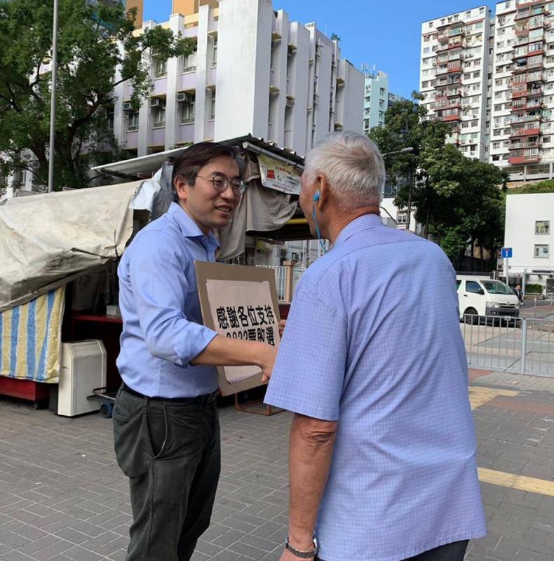 图:郑强峰在上月区选虽以381票之差败给洪骏轩,落区谢票时仍收到许多街坊鼓励与赞赏