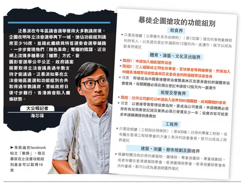 泛暴派在今年区议会选举获得大多数议席后,企图在明年立法会选举再下一城,抢占功能组别议席至少16席,并藉此继续为特首选委会选举铺路,一步步实现他们“颜色革命”夺权的阴谋。近日网上流传多种暴徒“种票”方式,妄图影响选举公平公正。政府议案需要取得立法会议员过半数支持才能通过,泛暴派如果在立法会地区直选和功能组别合共取得过半数议席,意味政府日后寸步难行,香港将会陷入瘫痪状态。\大公报记者 海芯葆