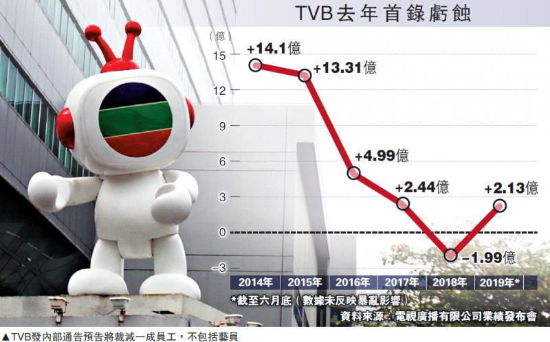暴乱摧残香港经济,裁员潮淹至电子传媒及演艺制作行业。本港电视龙头企业“电视广播有限公司”(TVB)宣布年底前裁减约350名员工,艺员部不受影响。有影视界人士直言,现时社会气氛低沉,本来已影响媒体广告收益,乱港暴徒又肆意针对TVB,吓窒部分商家不敢落广告。无綫镇台之宝汪明荃闻讯震惊,坦言“唔系好事”;立法会议员则担心TVB还有第二波裁员。\大公报记者 冯锡雄